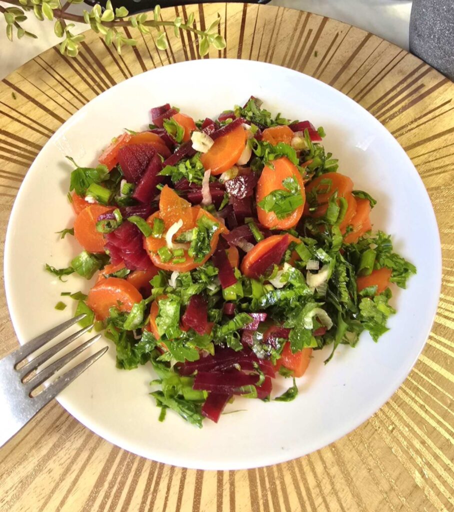 1.Нарежете свареното цвекло и морковите на малки парчета.